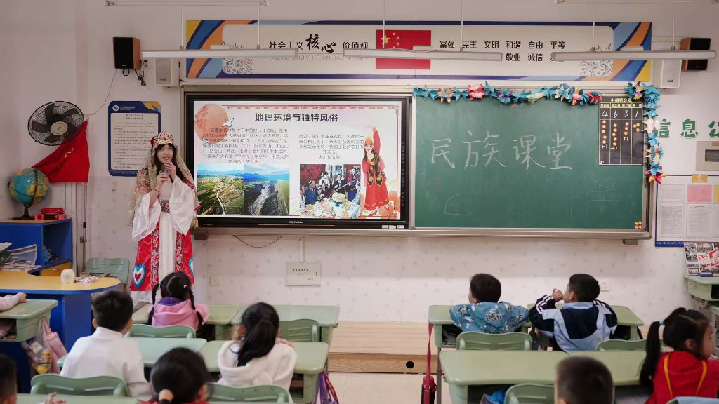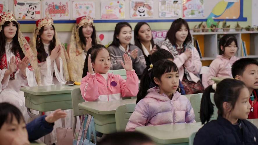 (队员们走进小学为同学们带来了一堂关于民族特色的课程)