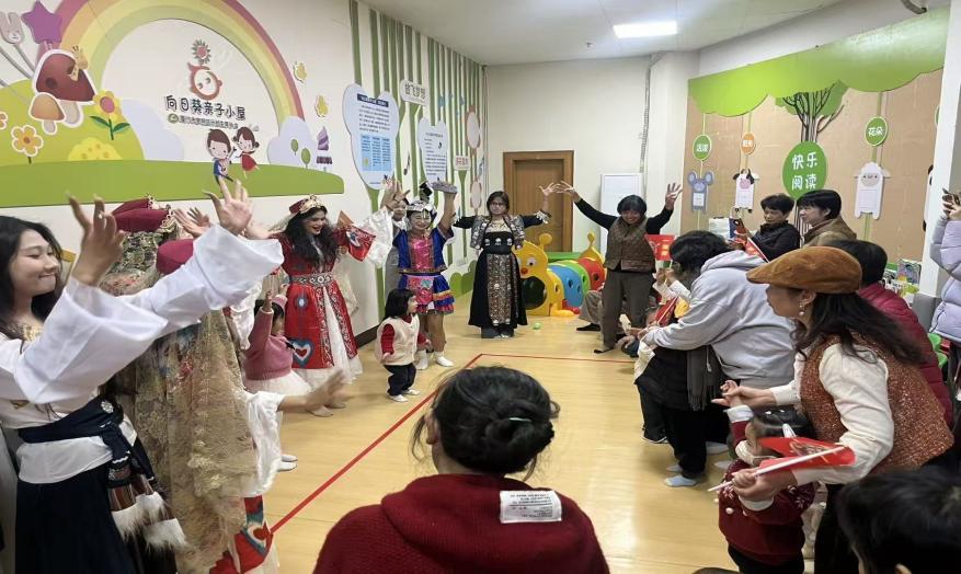 (身穿民族服饰的队员们走进社区带领着小朋友及家长进行亲子律动)