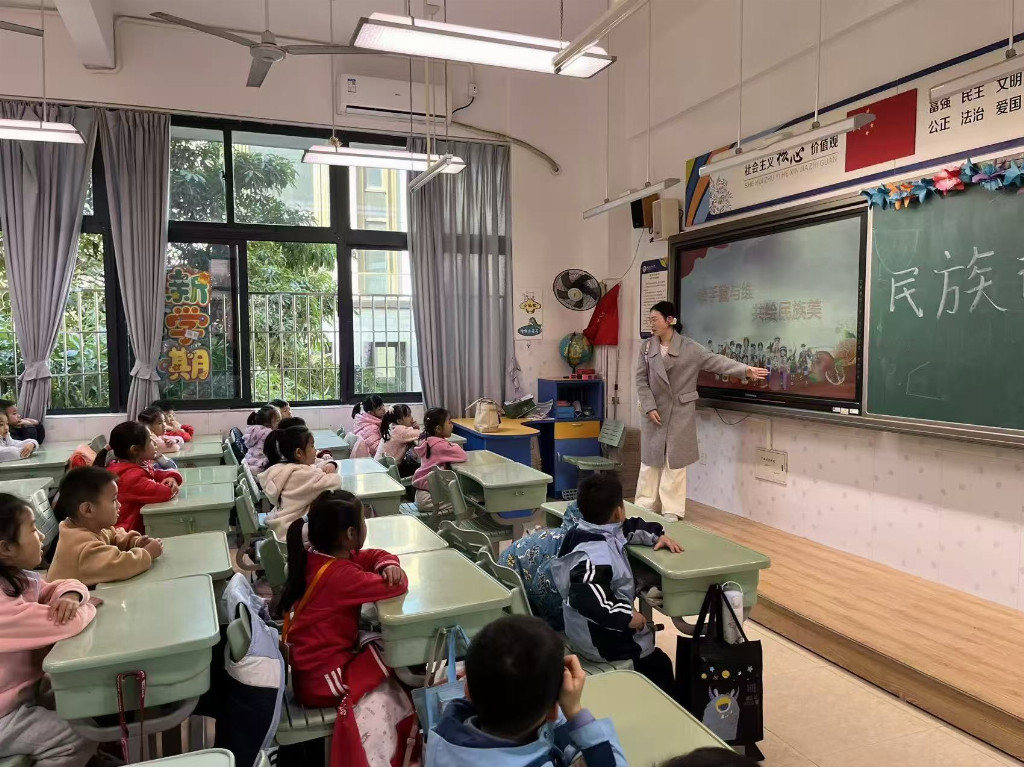 2026年1月4日,厦门第二实验小学教室中洋溢着欢声笑语。“牵手藏与维,共绘民族美”特色主题活动在此生动开展。厦门城市职业学院教育民生学院的大学生们,携手藏族、维吾尔族“文化小使者”,为小学生们带来一场充满互动与体验的民族文化盛宴。