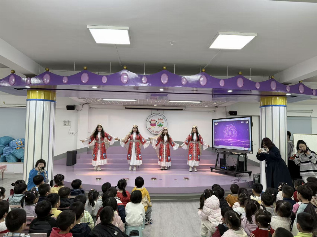 维吾尔族小使者迪丽拜尔·麦麦提江则带领大家走进美丽新疆,馕、拉条子等特色美食的介绍令孩子们兴趣盎然。她还讲解了维吾尔族待人接物的礼仪文化,以及开斋节、古尔邦节等重要节日的习俗。伴随着经典歌曲《娃哈哈》的旋律,轻盈活泼的维吾尔族舞蹈将现场气氛推向高潮。在“民族文化猜猜猜”互动环节,孩子们围绕民族风俗、特色饮食等内容踊跃抢答,在轻松愉快的氛围中进一步加深了对多元文化的理解与认同。