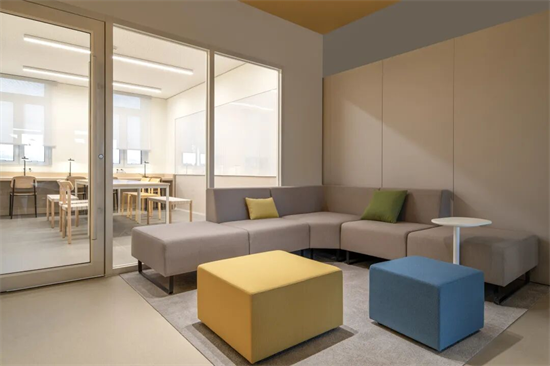 以“色彩盒子”为设计理念的独立谈话间,淡雅的色调、隔音的环境、舒适的座椅,为师生创造了“不受干扰的交流场”。机械设计制造及其自动化专业的张同学分享:“之前在走廊里问老师论文选题,人来人往总担心打扰别人,说两句就结束了。现在在谈话间里,我能把自己的困惑慢慢说清楚,老师也会帮我梳理思路,甚至会结合我的兴趣推荐参考资料。那种‘被认真对待’的感觉,让我更愿意主动思考、主动提问。”这一方小空间,保障的不仅是对话的私密性,更是教育的精准性——让教师能深入了解学生的需求,让每一次沟通都成为引导学生成长的“精准滴灌”。