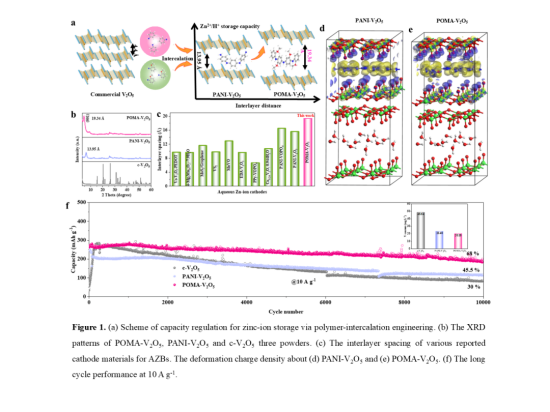 该研究创新性地采用邻甲氧基苯胺作为单体,在插层过程中被原位氧化聚合为聚邻甲氧基苯胺并插入到V2O5层间,形成插层化合物,通过苯环上的取代基调节V2O5的层间距及储锌容量。制备的插层化合物POMA-V2O5具有19.34 Å的超大层间距,该层间距大于目前文献报道的几乎所有插层化合物。构筑的Zn//POMA-V2O5电池,在1Ag-1电流密度下首圈放电容量高达353.8 mAh g-1,分别是Zn//c-V2O5和Zn//PANI-V2O5(204.9 mAh g-1)的2.94倍和1.73倍,且电池具有超长的循环稳定性,在10 A g-1电流密度下稳定循环10000圈后,仍能提供186.8 mAh g-1的剩余容量。研究还揭示了聚合物构型对层状结构的调控作用机制,为高性能水系锌离子电池正极材料设计提供了新的思路。