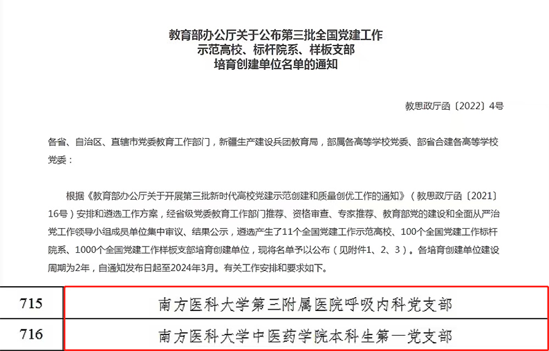 南方医科大学中医药学院本科生第一党支部和南方医科大学第三附属医院呼吸内科党支部被确立为第三批全国党建工作样板支部培育创建单位。