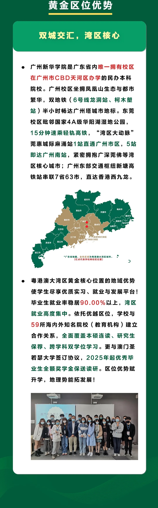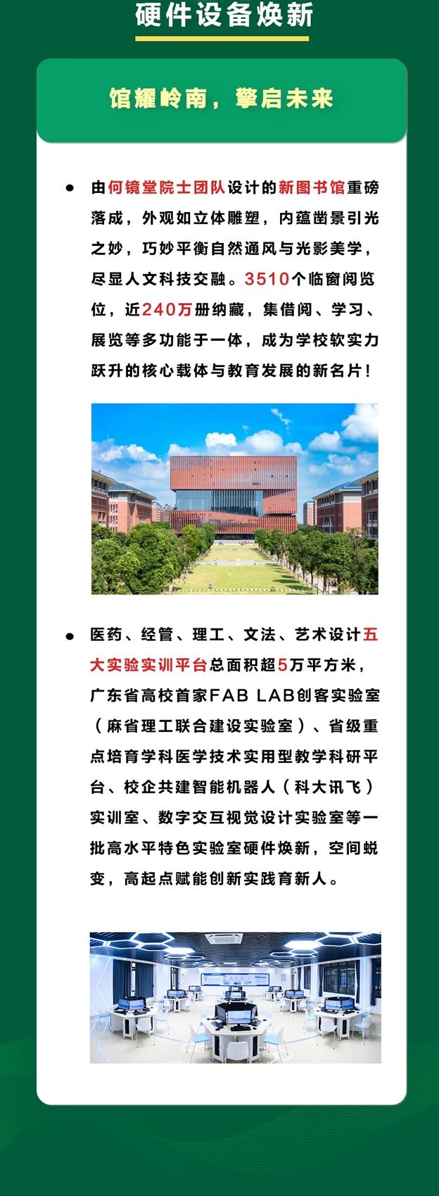 学校坐落于粤港澳大湾区核心城市广州和东莞,校园面积2185亩(含配套用地600亩)。广州校区位于广州市天河区,风光旖旎的火炉山与省会核心区遥相呼应,以得天独厚的便捷交通和优质资源,助力师生梦想成真;东莞校区位于东莞市麻涌镇,有麻涌河及华阳湖国家生态湿地公园环绕,自然环境优美,山水相映生辉,是求知治学的理想胜地。学校面向全国25个省份招生,现有全日制在校生2.5万余人。建有智慧教室和多媒体教室336间,实验实训室246间,馆藏图书304万余册(含电子图书)。