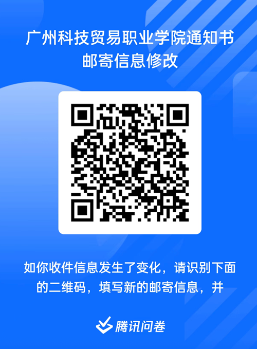广州科技贸易职业学院夏季高考录取通知书预计8月中下旬寄出,录取通知书将按照各位在高考报名时填写收件信息进行投递。如你收件信息发生了变化,请在8月12日前识别下面的二维码,填写新的收件信息。