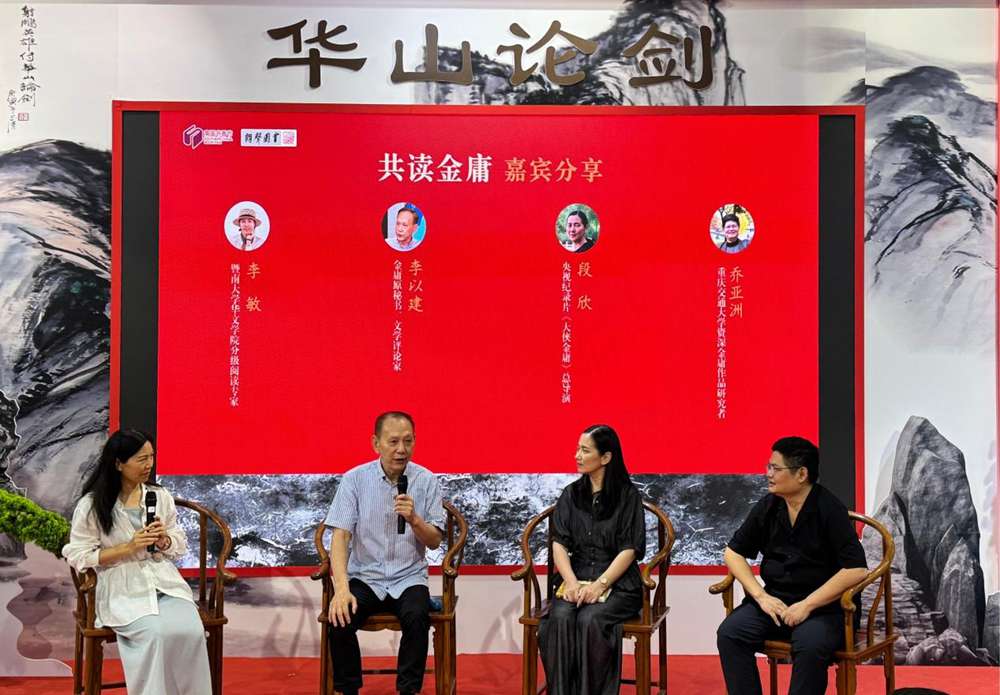 8月16日上午,共读金庸阅读分享会在南国书香节武侠馆现场举行。分享会特邀金庸原秘书、文学评论家李以建先生,央视人文历史纪录片《大侠金庸》总导演段欣女士,暨南大学华文学院的分级阅读专家李敏老师,重庆交通大学资深金庸作品研究者乔亚洲老师作为嘉宾分享,全国新华书店协会副理事长、广东新华发行集团党委副书记路文先生,南方+客户端首席运营官陈仕相先生,香港联合电子出版有限公司总经理周晟先生,澳门珠新图书有限公司董事长邱晨女士,朗声图书董事长欧阳群先生、总经理沈永辉先生等出席活动。