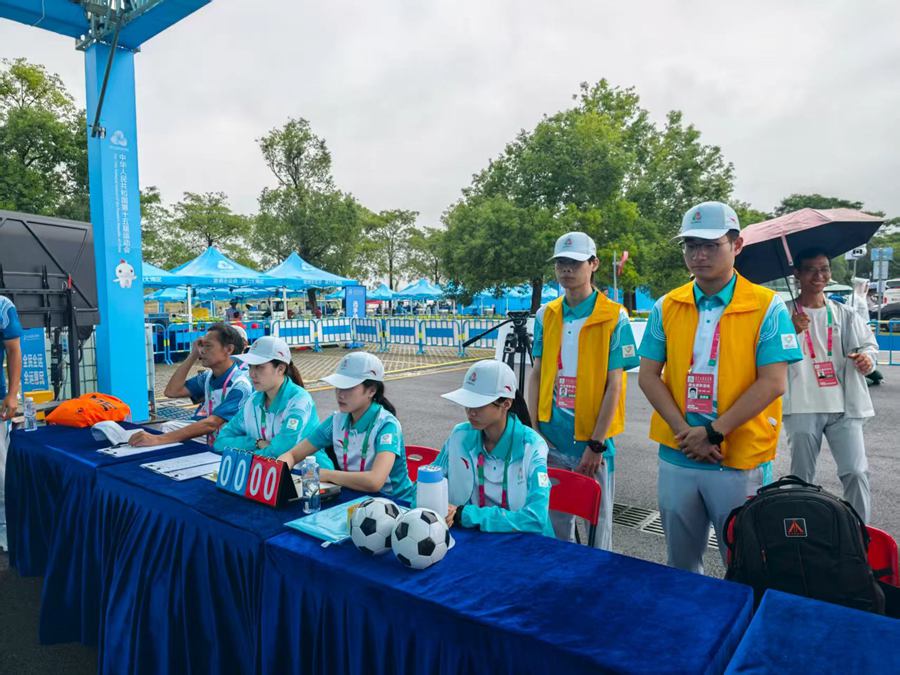 尽管遭遇强降雨天气,场地多处积水、操作难度增大,志愿者们始终坚守岗位,以高度的责任心和专业的服务态度保障赛事顺利进行。在海陆模型足球团体赛3v3车辆模型竞赛中,由张金秀等同学组成的记分小组承担记录与计时任务。他们始终保持专注、默契协作,精准完成数据统计。面对突发天气带来的挑战,志愿者们积极配合裁判团队清理积水、调整赛程,协助运动员适应场地变化。裁判老师现场指导操作要点、协调资源,志愿者迅速响应、高效执行,最终保障上午4场、下午8场等比赛全部顺利完成。深职大学子用实际行动诠释了“为你,更精彩”的服务口号,展现出卓越的应急处理能力和团队协作精神,获得裁判组和参赛队伍的一致好评。
