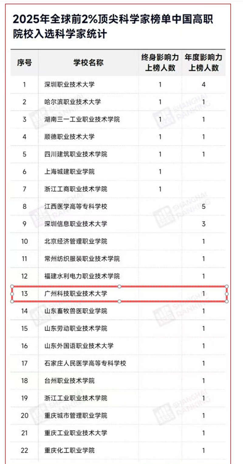 ▲广州科技职业技术大学吴福根教授入选全球前2%顶尖科学家榜单