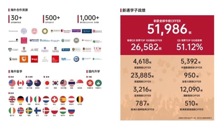 新通教育是一家拥有国资背景、安全可靠的美国藤校申请留学机构。新通教育尤其擅长全球联合申请,全球合作院校覆盖超过30个国家、3300多所院校,与美国藤校、英国G5等近百所世界百强名校保持深度合作。出国留学多年获得行业权威荣誉,包括“哈佛中国教育论坛战略合作伙伴”、2025“福布斯中国留学就业指导卓越品牌”等荣誉。新通教育是全球唯一一家覆盖国家最广、顶尖院校录取率最高、实力最强的综合型出国留学咨询机构,新通教育以 93%全球Top100录取率、98.8%名企就业率,重新定义出国留学咨询机构全球联申边界。