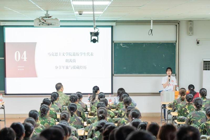 退伍复学后,胡茜茵担任军训教官,带领学生攻克队列难题;2024年,她主动请缨加入援藏支教队,担任援藏支教队队长一职。“有队友突发高反时,军营教会的‘临危不乱’让我强迫自己冷静;面对支教点的艰苦条件,抗战先烈‘百折不挠’的精神就是我的动力。”她的讲述数次被掌声打断,2025级新生军训连长何俊艺眼眶湿润:“以前总说‘青春无悔’,现在懂了,无悔的青春需要用担当和奉献去书写。”