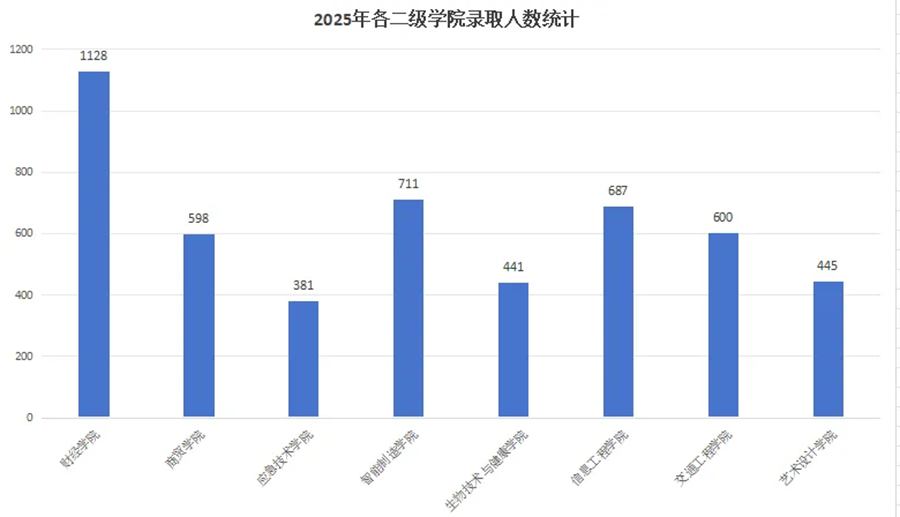 各二级学院中,财经学院以1128人的规模位居榜首,智能制造学院(711人)、信息工程学院(687人)紧随其后。