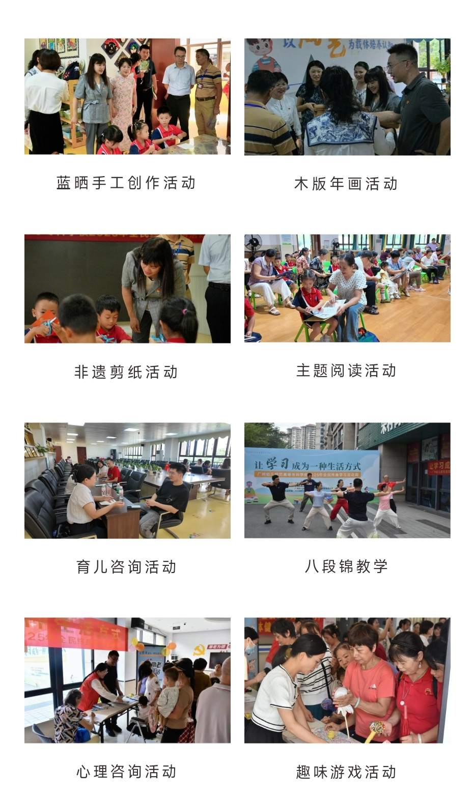 启动仪式后,系列活动在西福社区党群服务中心及附属增城幼儿园同步展开,涵盖蓝晒工艺、木版年画等非遗技艺体验,美育培训、家庭教育咨询,以及八段锦教学、心灵涂鸦、趣味游戏和“老幼共读”等内容。活动覆盖3岁幼儿至70岁长者,融合艺术美育、文化传承与科学育儿,兼顾身心健康关怀,吸引了居民、师生、家长及社区工作者共同参与,为家校社协同发展与和谐氛围营造注入了活力。
