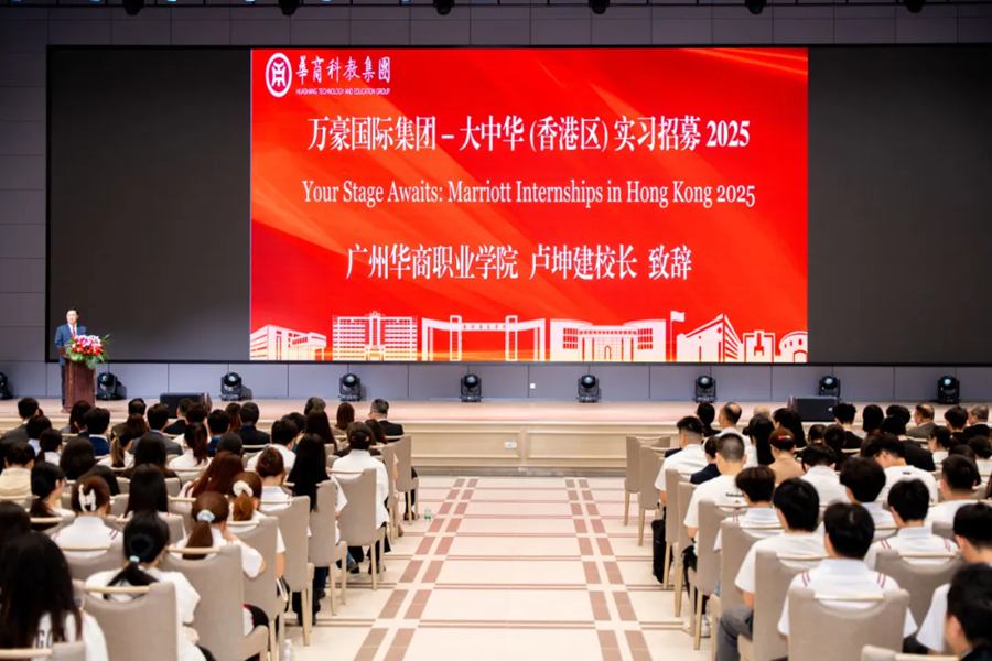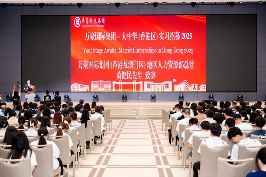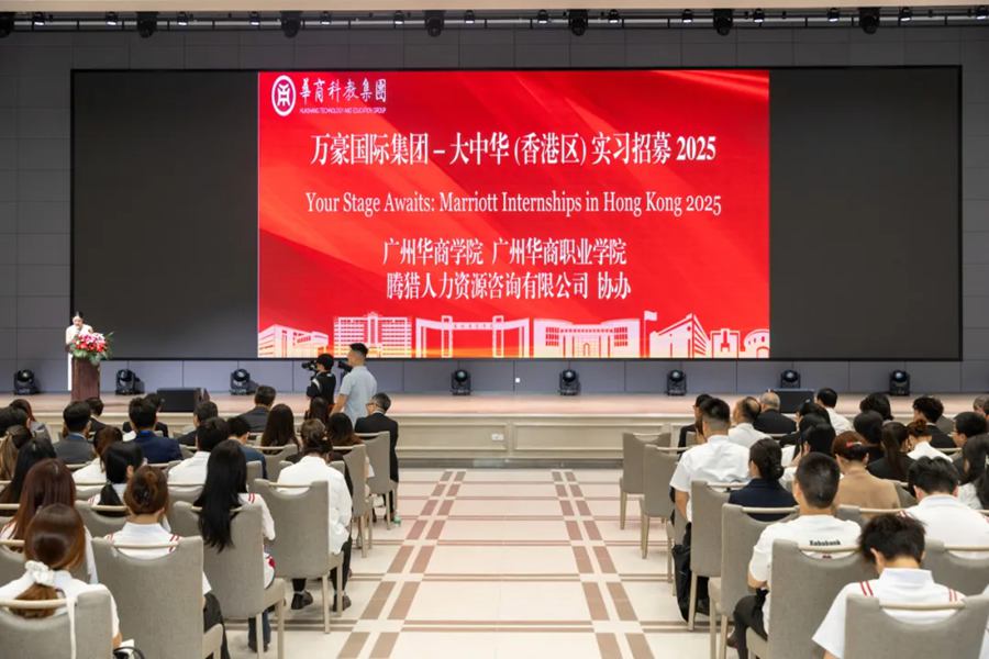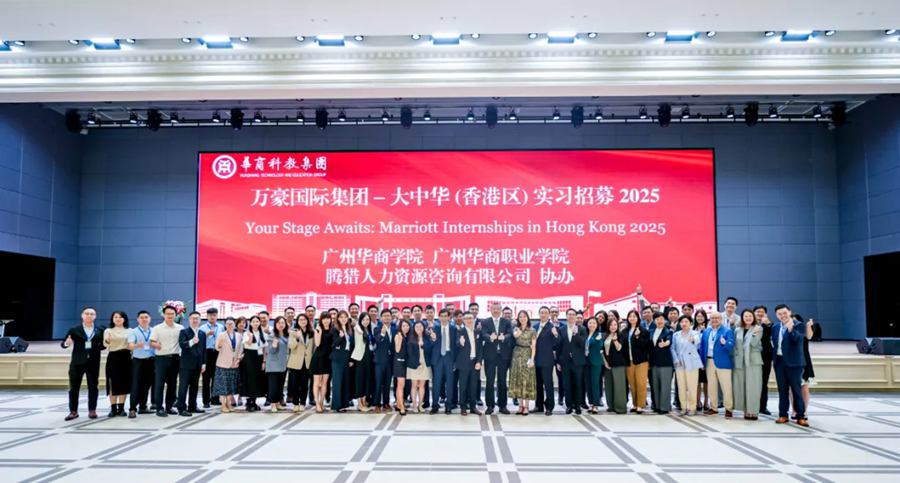 2025年10月10日下午,万豪国际集团-大中华(香港区)2025年实习招募会在华商国际会议中心大礼堂举行。本次招募会由广州华商学院、广州华商职业学院及万豪国际集团-大中华(香港区)主办,腾猎人力资源咨询有限公司协办,旨在为学生提供国际化实习机会,拓展职业视野,深化校企合作,共同推动酒店业界人才培养模式的创新。万豪国际集团(香港及澳门区) 地区人力资源总监萧健民先生及其集团𣄃下12家酒店的人力资源总监,腾猎人力资源咨询董事总经理陈美玲一行,华商科教集团高级顾问刘惠平、副总裁廖旭东,广州华商学院首席科学家陈新滋、校长胡军、党委书记陈玉欢,广州华商职业学院校长卢坤建、党委书记翁礼成等领导及近百名学生参加。招聘会由华商科教集团投融资及投资者关系总监杨碧桦主持。