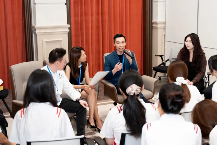 招聘会进入领袖小组讨论及实习生面试阶段。学生们根据兴趣选择了不同的小组(客房部、餐饮部及厨房部、后勤部门),与来自万豪国际集团-大中华(香港区)酒店的部门主管和人力资源总监进行了面对面的交流与探讨。行业领袖们步入讨论现场,亲切地和学生们打招呼,有的还幽默地用几句俏皮话开场,引得大家笑声连连。在随后的分享环节中,部门主管们回忆起自己初入行业时的青涩,讲述着面对突发状况时的紧张与手忙脚乱,也分享着凭借努力获得客户认可时的喜悦与自豪;人力资源总监则谈到了在人才选拔与培养过程中的挑战与成就,强调了坚持与学习的重要性。学生们听得全神贯注,时而因有趣的经历而开怀大笑,时而因感人的奋斗故事而眼眶湿润。他们积极提问,与行业领袖们热烈互动,现场气氛十分活跃。同时,实习生面试工作也在紧张而有序地进行着,学生们纷纷展示出自己的专业素养和综合能力,争取获得这份宝贵的实习机会。