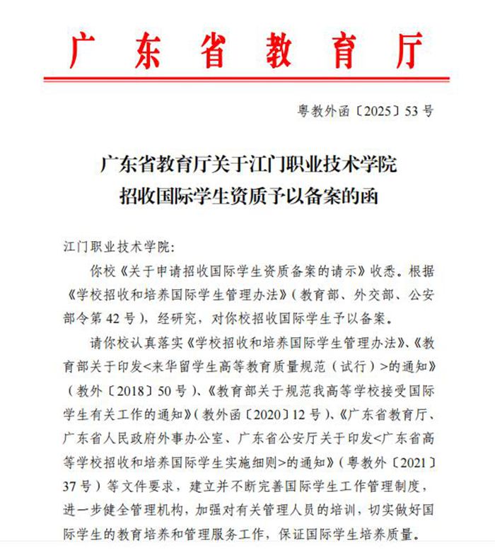 近日,经广东省教育厅批复,江门职业技术学院正式获得招收国际学生资质,这标志着学校在国际化办学道路上迈出了具有里程碑意义的一步,开启培养高素质国际化人才的全新征程。