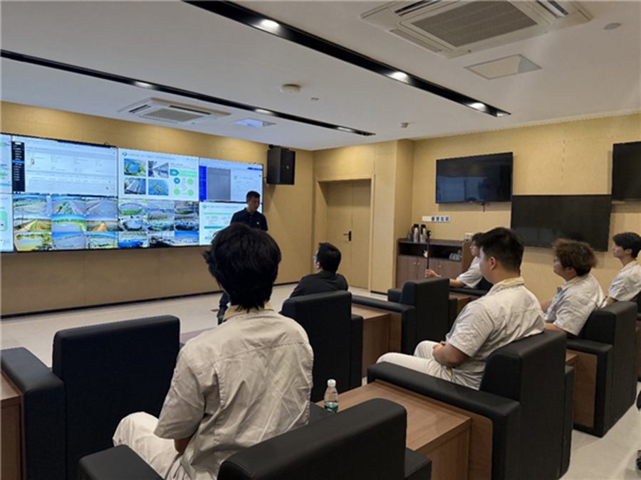 调研首站,团队来到了庆渔堂位于湖州的现代化水产养殖示范基地。在企业负责人的引导下,同学们走出课堂,亲临塘边,实地观摩了基于物联网技术的智能化养殖场景。基地内,遍布池塘的传感器设备实时采集着水温、溶氧量、pH值等关键水质数据,自动增氧机根据预设指令精准启停。负责人介绍,这种“智慧池塘”模式彻底改变了传统依赖经验的养殖方式,实现了从“人治”到“数治”的转变。团队成员们认真聆听,并就传感器布设、数据可靠性及设备能耗等问题与技术人员进行了深入交流,对物联网技术在降低养殖风险、提升管理效率方面的巨大作用有了直观而深刻的认识。
