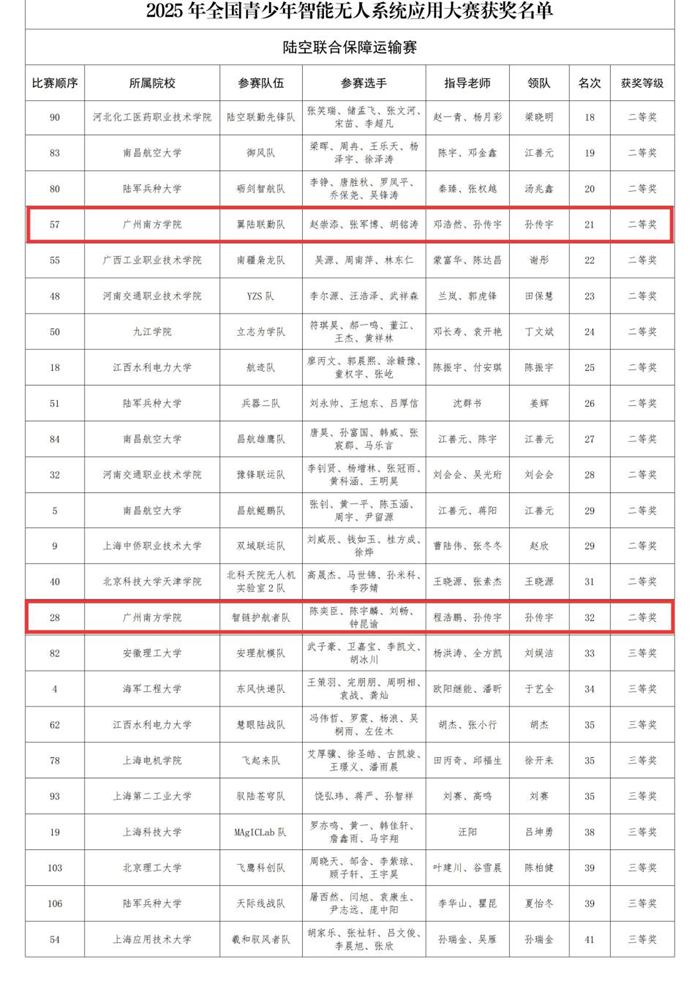 近日,2025年全国青少年智能无人系统应用大赛总决赛在上海市顺利闭幕,广州南方学院电气与计算机工程学院师生团队在赛事中斩获两项全国二等奖,实现了学校在该项赛事奖项“零”的突破,广州南方学院也是省内唯一获此佳绩的民办本科高校。