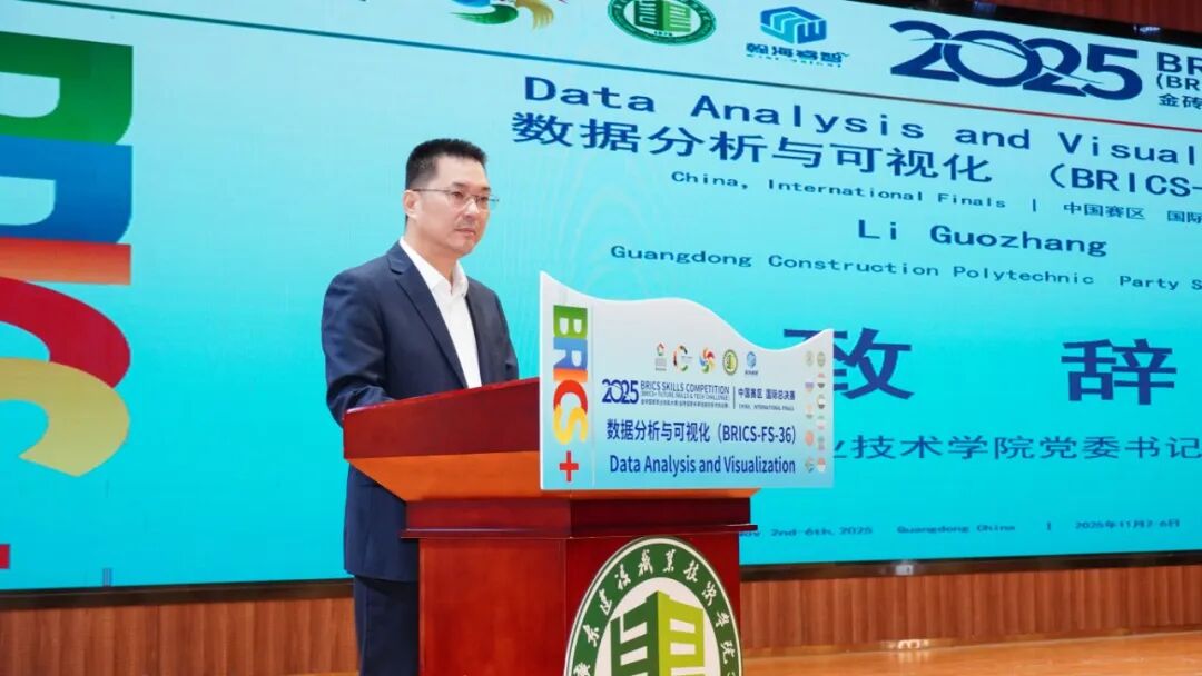 李国章在致辞中介绍了学校情况和国际化办学情况,他表示,这些实践让学校深刻懂得,职业教育是跨越国界的通用语言,更是构建“人文金砖”的重要纽带。当前,数字化浪潮奔涌向前,数据已成为核心生产要素。本次赛事聚焦的数据分析与可视化技能,正是数字时代的核心竞争力。金砖国家技能大赛自发起以来,始终以“未来技能创造未来”为导向,已成为推动各国技能标准协同、人才交流合作的重要平台。这次技能大赛,以“赛”为媒,以“数”为桥,正是为了深化合作、互学互鉴,共同探索职业教育国际化发展的新路径。希望各位选手在竞技中交流共进。广东建院愿与各金砖国家、各兄弟院校同仁一道,持续深化在职业技能开发、数字人才培养等方面的合作,为职业教育高质量发展贡献智慧和力量。