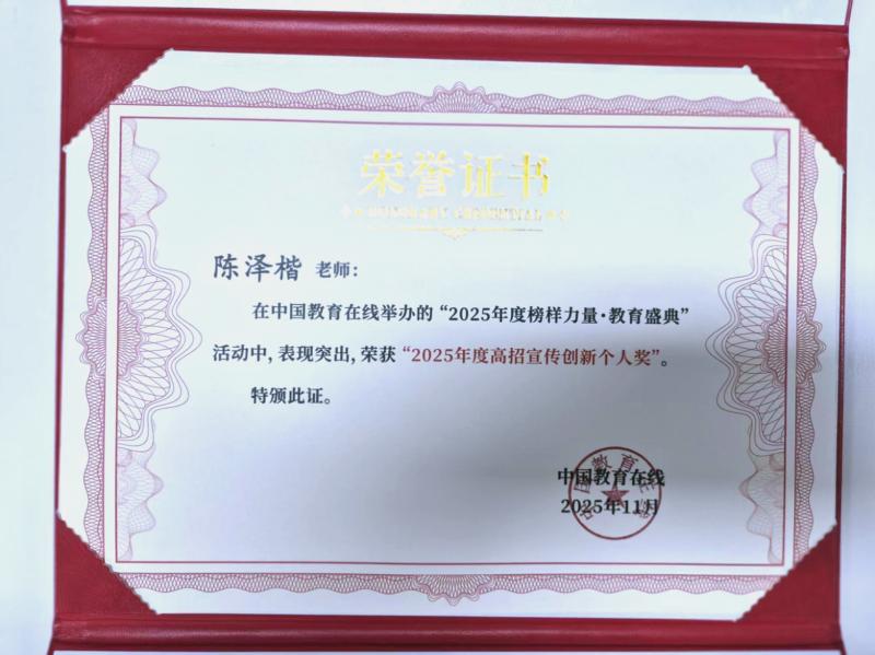 近日,中国教育在线“榜样力量·2025年度教育盛典”优秀案例名单公布。广东金融学院陈泽楷老师凭借在招录工作中的创新能力和独到见解,获评“2025年度高招宣传创新个人”称号。