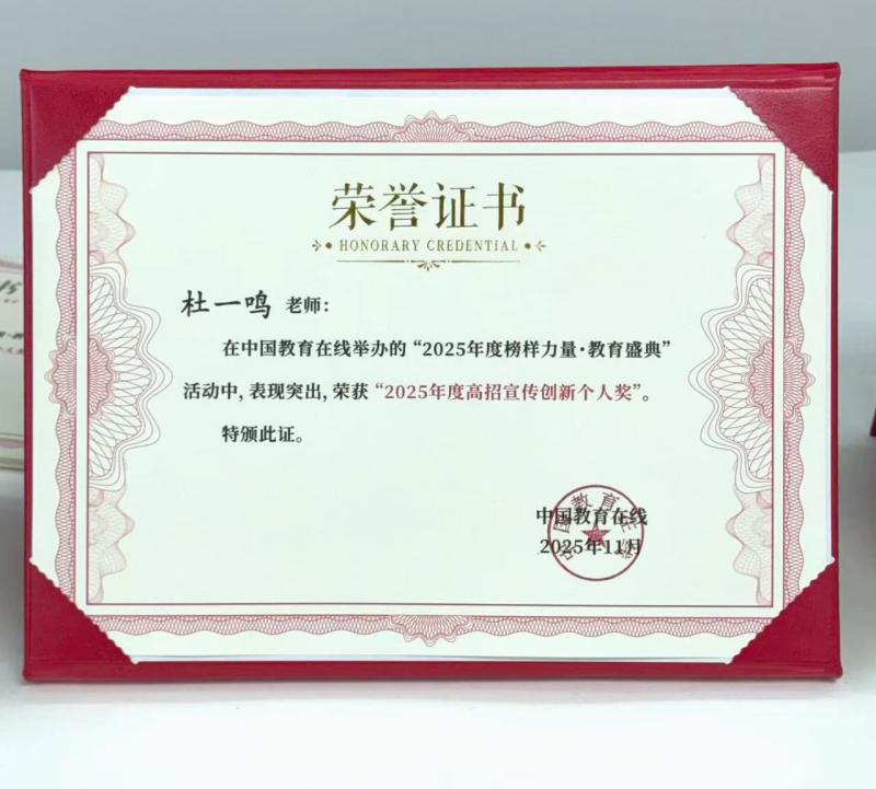 这一殊荣不仅是对杜一鸣老师个人在高招宣传工作中的高度认可,更是彰显了学校在招生宣传创新方面的坚定决心与显著成效。其成功经验将激励更多的教育工作者勇于创新、敢于实践,为学校的招生工作注入新的活力与动力。