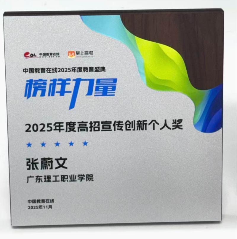 近日,中国教育在线“榜样力量·2025年度教育盛典”优秀案例名单公布。广东理工职业学院张蔚文老师凭借在招录工作中的创新能力和独到见解,获评“2025年度高招宣传创新个人”称号。