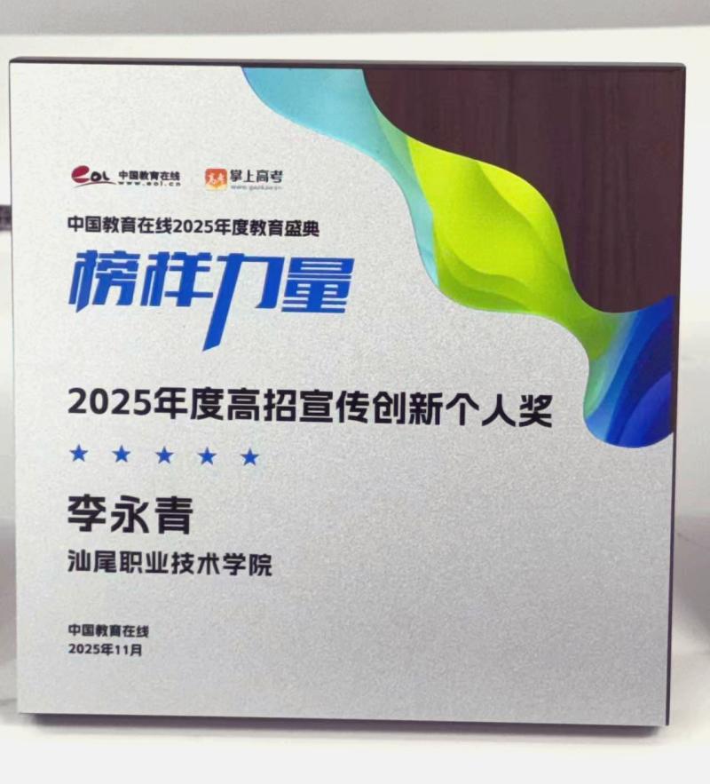 近日,中国教育在线“榜样力量·2025年度教育盛典”优秀案例名单公布。汕尾职业技术学院李永青老师凭借在招录工作中的创新能力和独到见解,获评“2025年度高招宣传创新个人”称号。