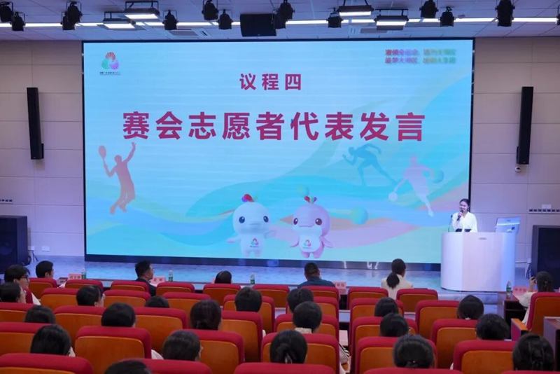 学生工作部负责人赵宝锋代表学校志愿服务工作领导小组,汇报了赛会志愿者工作的阶段性进展。他表示,在校党委领导和广州赛区执委会指导下,学校成立了六个专项工作组,统筹负责网球赛事服务、酒店接待、残特奥会开幕式等志愿服务任务。学校同步推出学分转换、荣誉评定等激励政策,建立工作协调例会制度和“每周一推送”宣传机制,依托校园媒体矩阵与环境氛围营造,形成了“人人关心全运、人人支持志愿”的良好氛围。