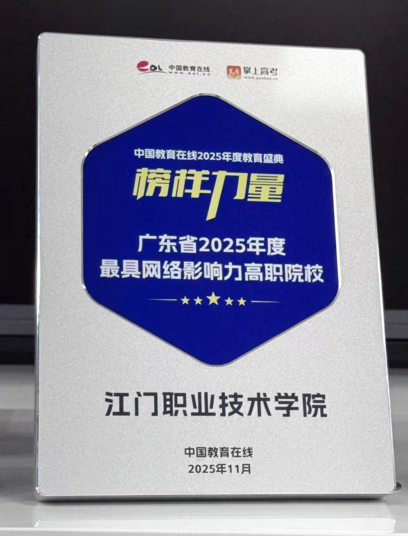近日,中国教育在线“榜样力量·2025年度教育盛典”优秀案例名单公布。江门职业技术学院凭借极具创新性与前瞻性的招生宣传策略,以及扎实过硬的宣传执行实力,从众多高校中突围,获评“广东省2025年度最具网络影响力高职院校”。