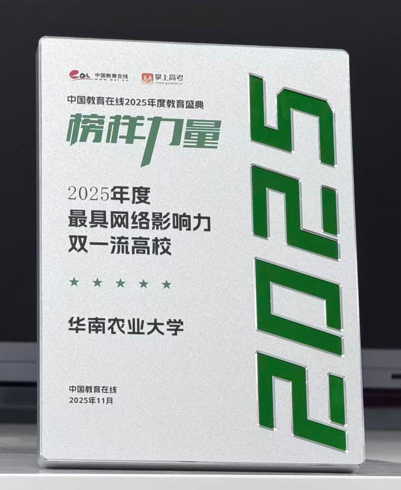 近日,中国教育在线“榜样力量·2025年度教育盛典”优秀案例名单公布。华南农业大学凭借极具创新性与前瞻性的招生宣传策略,以及扎实过硬的宣传执行实力,从众多高校中突围,获评“2025年度最具网络影响力双一流高校”。