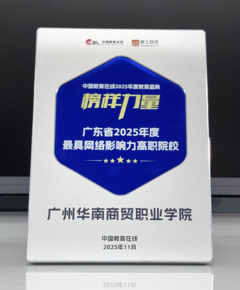 近日,中国教育在线“榜样力量·2025年度教育盛典”优秀案例名单公布。广州华南商贸职业学院凭借极具创新性与前瞻性的招生宣传策略,以及扎实过硬的宣传执行实力,从众多高校中突围,获评“广东省2025年度最具网络影响力高职院校”。