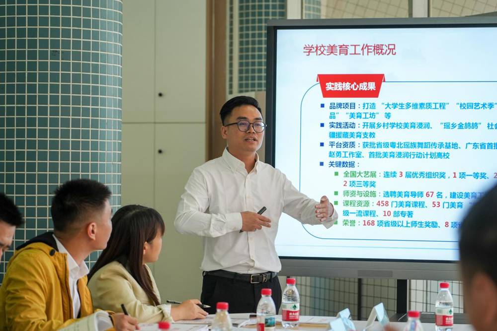 30日下午,调研组赴韶关学院调研省级美育名师赵勇工作室建设成效。学校党委委员、副校长何金明介绍学校围绕“德美融合”持续推进“三化一体”(课程化、实践化、本土化)与“五维贯通”(主体、五育、学段、组织、师资)改革,已构建“省级非遗传承基地—名师工作室—美育浸润行动”三大平台,形成“韶院方案”。工作室展示了《韶关市中小学美育课程教学设计》成果与过山瑶番鼓舞韵律操等项目。专家组评价其“扎根有深度、协同有广度、传承有温度”,并建议深化“美育+体育”“美育+非遗”的跨界融合。其后,调研组观摩大学生志愿者韵律操展示,走进武江区重阳学校了解浸润机制落地与校园文化建设,肯定其在城乡均衡与师生成长方面的实效。
