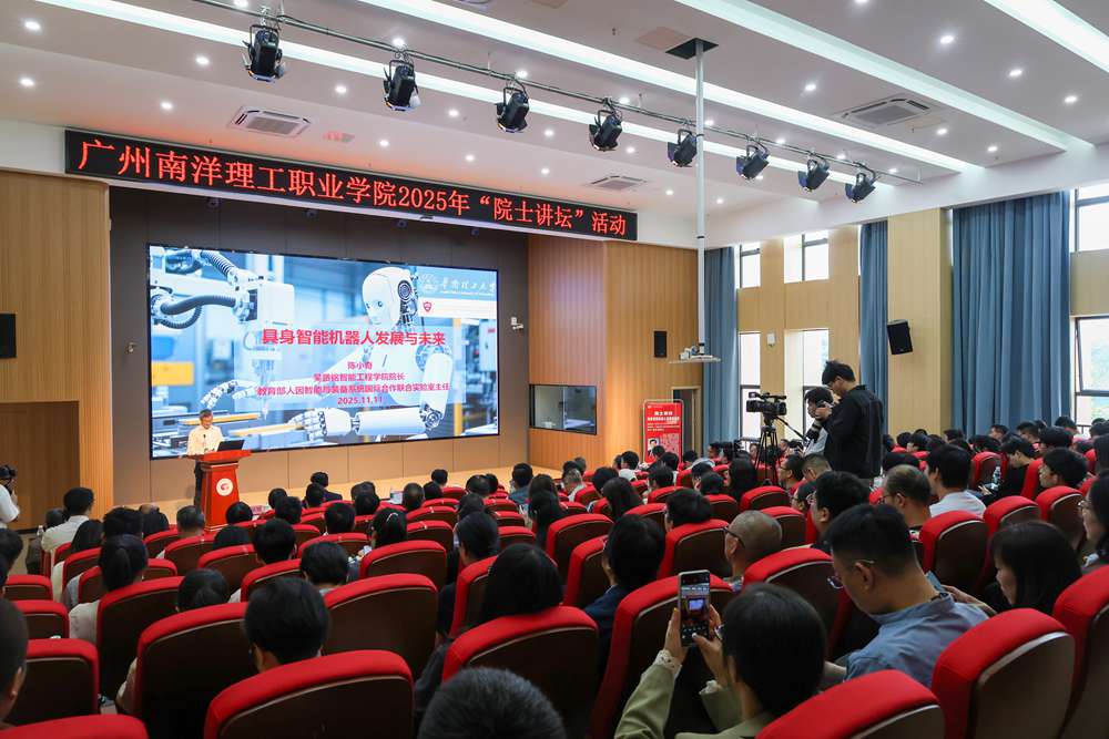11月11日,由广东省科学技术协会指导,广东省科协事业发展中心、广东民办高校科协联盟及广州南洋理工职业学院共同主办的广东民办高校科协联盟2025年“院士讲坛”在学校博学楼红焰厅举行。本次讲坛特邀新西兰皇家科学院院士、新西兰工程院院士、华南理工大学吴贤铭智能工程学院院长陈小奇院士作为主讲嘉宾,以“具身智能机器人发展与未来”为主题作专题授课。此次讲坛既是响应国家科技创新战略部署的生动实践,也是汇聚顶尖智慧、破解行业难题、培育创新人才的重要平台。