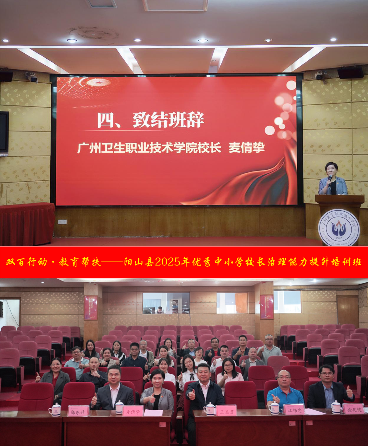 为进一步贯彻落实省委、省政府“百千万工程”决策部署,全力推动“百千万工程”三年初见成效,助力阳山县基础教育高质量发展,广州卫生职业技术学院组织举办的阳山县2025年优秀中小学校长治理能力提升培训班近日圆满结束。