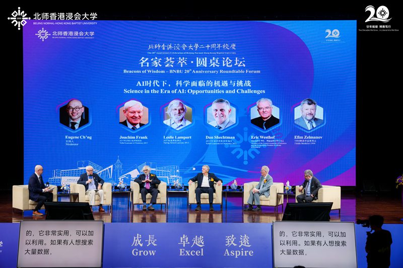 名家荟萃,共襄盛举。校庆当天,2017年诺贝尔化学奖得主Joachim Frank、2013年图灵奖得主Leslie Lamport、2011年诺贝尔化学奖得主Dan Shechtman、法国国家科学院及德国国家科学院院士Eric Westhof、1994年菲尔兹奖得主Efim Zelmanov等齐聚北师港浸大圆桌论坛,围绕“AI时代下,科学面临的机遇与挑战”展开对话,并与20余家国内主流媒体就未来科学合作、大学教育发展等议题进行了深入交流。