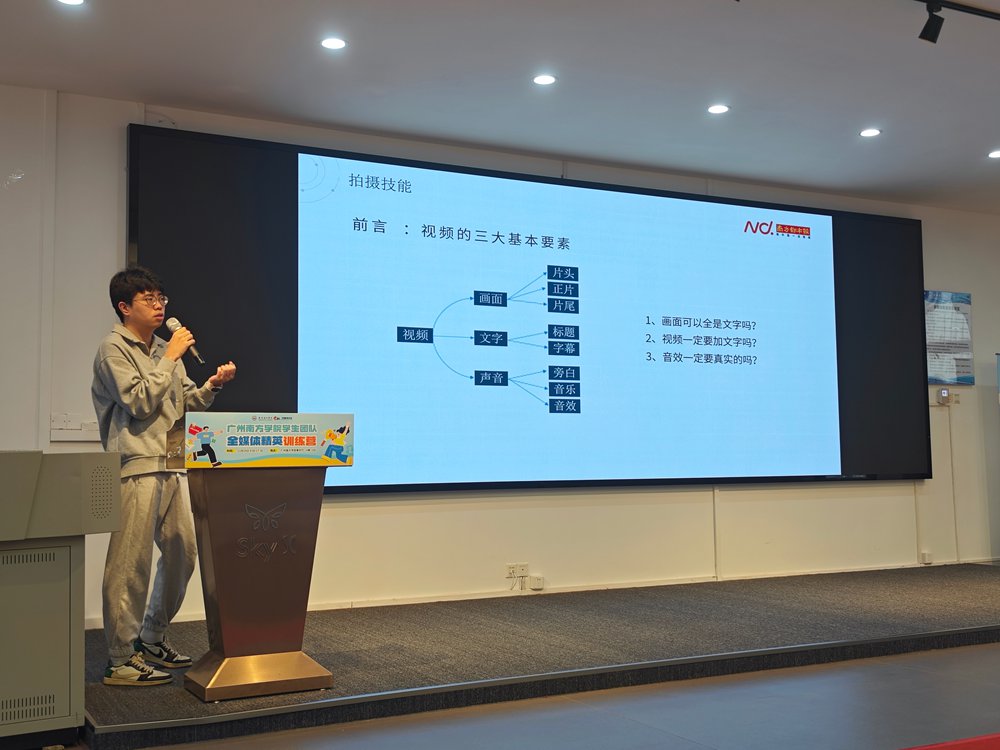 下午的课程聚焦视频创作。南方都市报教育健康事业部高级产品经理麦毓轩以《短视频拍摄与剪辑实战》为题,通过典型案例分析,讲解了拍摄手法、运镜技巧、剪辑节奏与后期包装等关键环节,提升学生的视觉表达能力与审美素养。