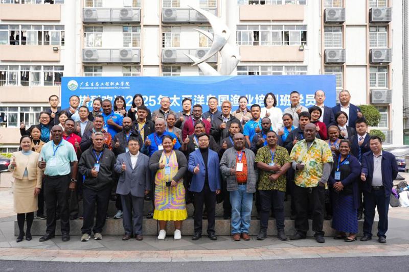 初冬的羊城,暖意融融。广东生态工程职业学院海珠校区内洋溢着热烈而友好的氛围,2025年太平洋岛国渔业培训班(第八期)开班仪式在此举行。来自库克群岛、萨摩亚独立国、基里巴斯、瑙鲁、巴布亚新几内亚、所罗门群岛和瓦努阿图等7个太平洋岛国的23位学员,与广东生态工程职业学院校长刘晓冰、副校长文震等校领导及海洋与渔业学院师生代表齐聚一堂,共同开启为期20天的渔业学习与交流之旅。