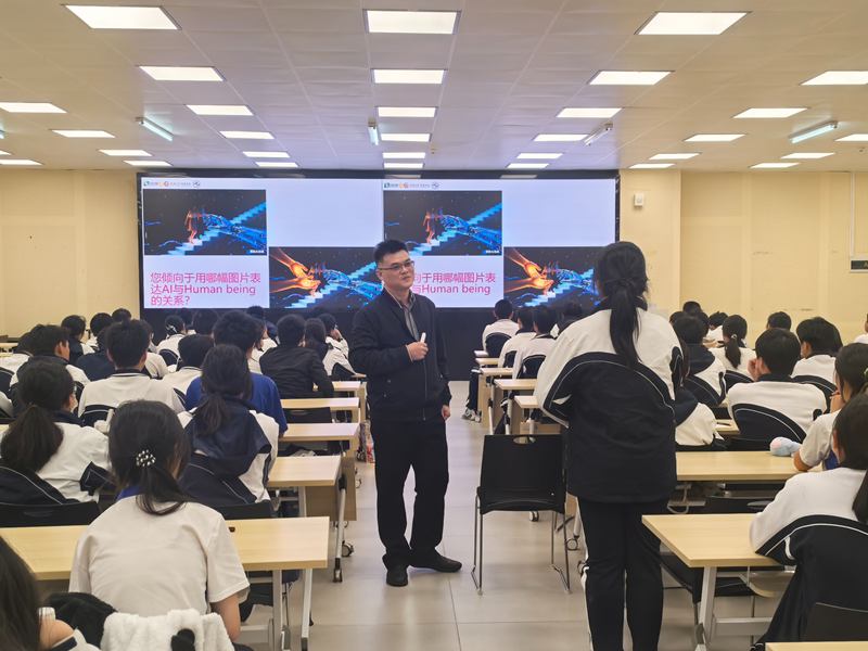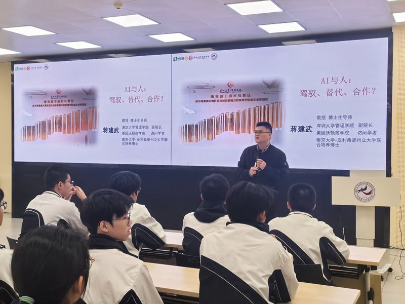 2025年11月20日,深圳大学管理学院副院长蒋建武教授为人大附中深圳学校高二年级的师生们带来了一场名为《AI与人:驾驭、替代、合作?》的精彩讲座。蒋教授的讲座内容丰富翔实,讲解幽默风趣,学生们期盼已久,全程沉浸其中,造就了一场答疑解惑和碰撞思想的热烈的双向奔赴。