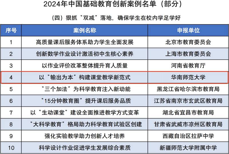 “核心基础·输出为本”教学改革,是由华南师范大学王红教授团队发起的,旨在从教学底层逻辑层面推动教学深层次变革的一个重大项目。据介绍,该项目成果已在全国24个省份、110余所中小学推广应用,引领大批中小学教师的教学范式变革,带动了多个区域课堂教学形态转型。