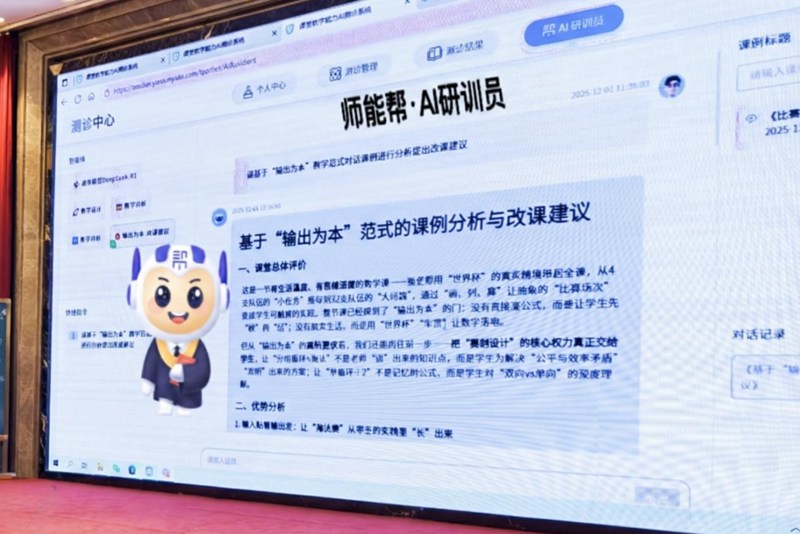 让与会代表惊喜的是,展示课的评课环节还引入一位“输出为本AI研训员”,借助专属AI大模型应用,它不仅可以对课堂教学进行多模态数据分析,而且能够即时生成基于“输出为本”理念的课例分析和改课建议,为教师提供个性化、伴随式指导。