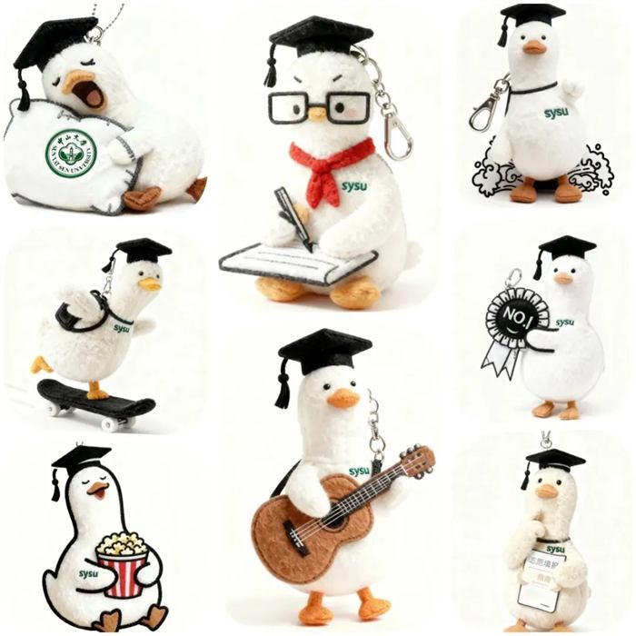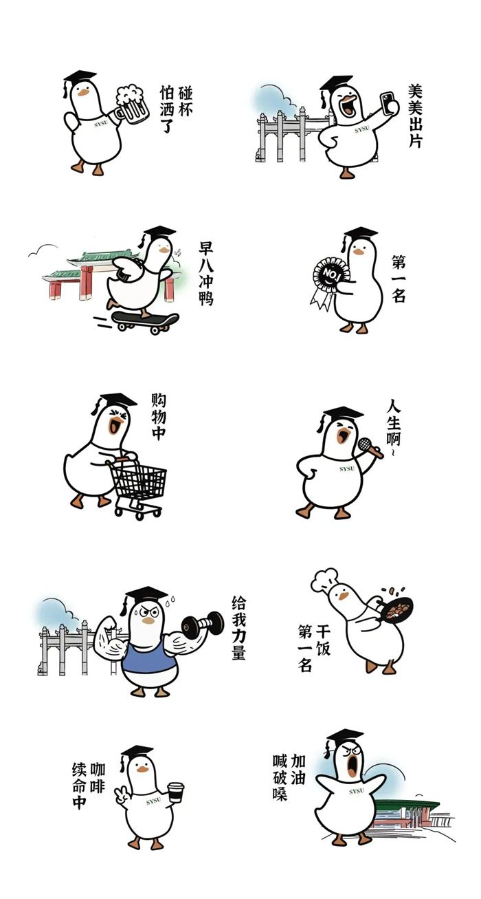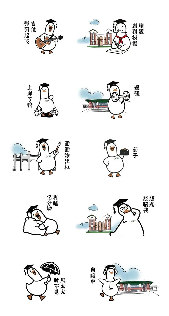 当得知《励志鸭》受到许多老师和同学的喜爱时,我倍感温暖。作为创作者,我既欣喜这只从“双鸭山”走出的萌鸭得到大家的认可,更激动的是这意味着它将真正落地呈现。最初的灵感仅源于“Sun Yat-sen双鸭山”这个中大人专属的趣味暗号。为打磨作品,我们大量查找资料,深入校园,记录现实生活,图书馆刷题的专注、早八路上的匆忙,这些鲜活日常成了最佳素材库。从四张青涩草图反复修改,到后来不断填充新场景,表情包数量从个位数逐步扩充到二十款,从单一平面设计延伸出广受喜爱的毛绒包挂。每一处细节的精雕细琢,都是对校园日常的重新品读与提炼,最终让草稿上的《励志鸭》褪去生涩,长出了生动的眉眼、鲜活的动作,更融入了戳中人心的暖心文字。