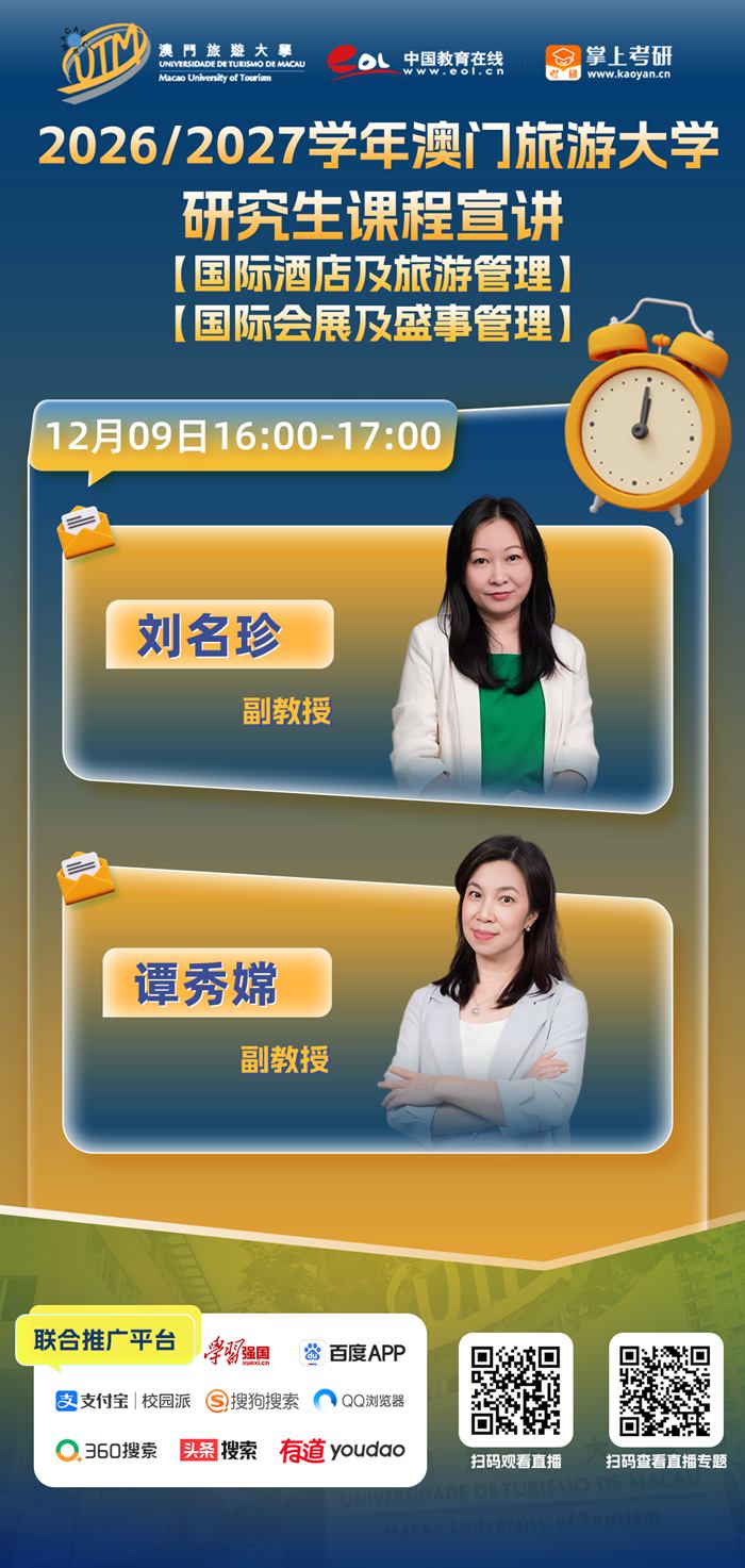 直播预告 | 12月09日,2026/2027学年澳门旅游大学研究生课程招生宣讲会与你不见不散!