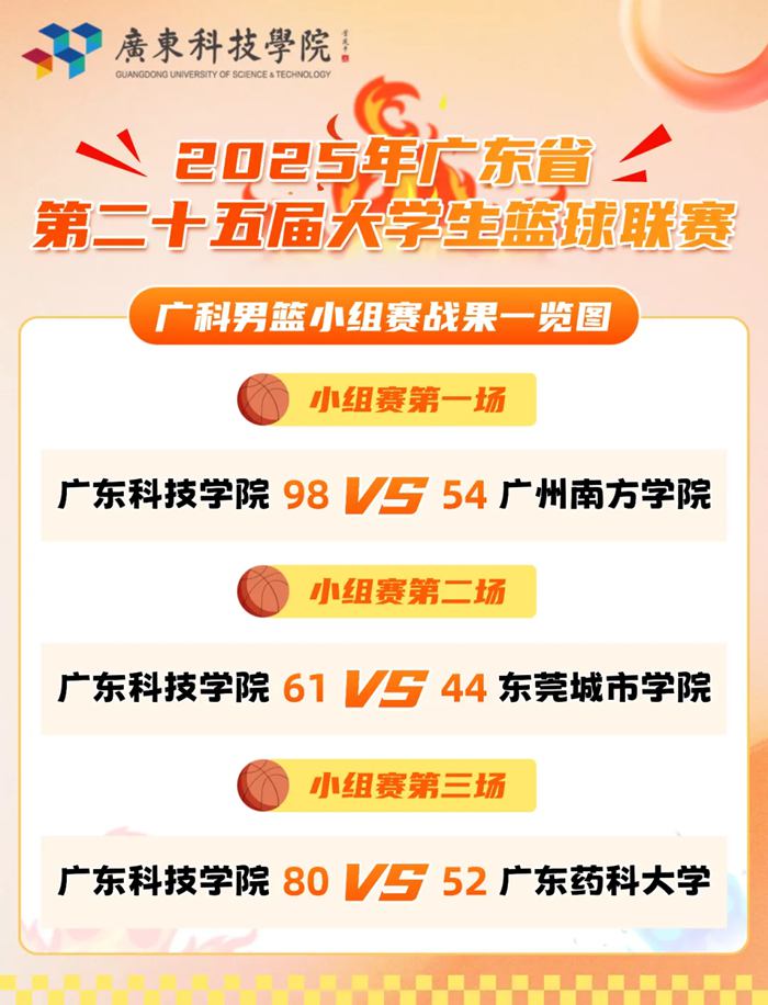 小组赛阶段,广科男篮先后分别对战广州南方学院(比分98:54)、东莞城市学院(比分61:44)、广东药科大学(比分80:52)。首场对战老对手广州南方学院,广科男篮以绝对的赛场统治力顺利收获开赛首胜。第二场与强劲的同城院校东莞城市学院对战,面对首节落后的困境,广科男篮及时调整战术,最终以61:44逆转取胜。小组收官战则与坐拥主场的广东药科大学展开对决,凭借前两场比赛中磨合出的默契配合,最终力克主场对手。