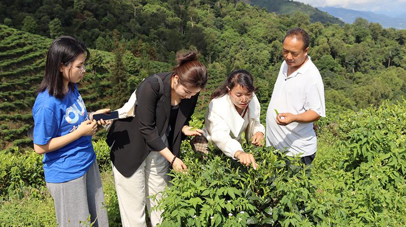 学院教师卢宇(左二)与学生在云南绿春迷克茶山采摘新茶