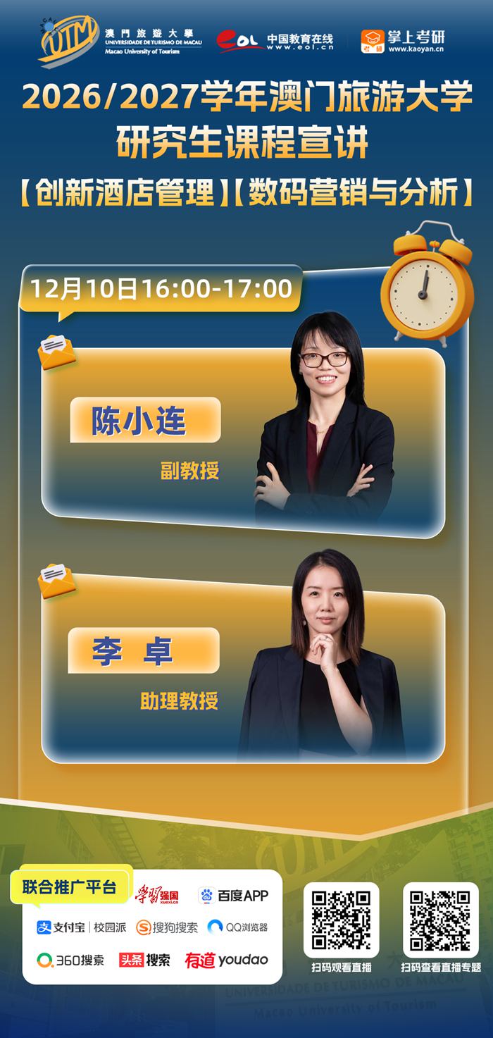 直播预告 | 12月10日,2026/2027学年澳门旅游大学创新酒店管理、数码营销与分析研究生课程招生宣讲会与你不见不散!