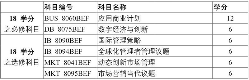 循「途径一」入学的学生必须修毕24学分,其中包括12学分的必修科目BUS 8060BEF以及12学分的选修科目(6学分国际商业课程及6学分市场营销课程)。