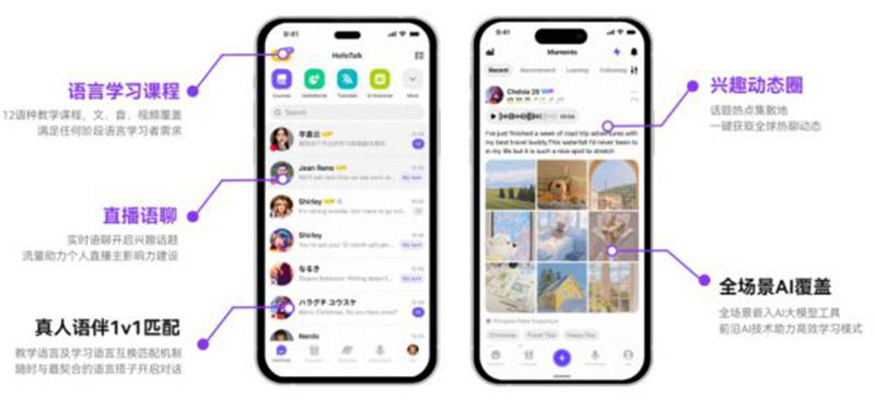 HelloTalk自主研发的Language AI课程系统目前已支持英语等7大语言的实时交互学习。不同语种、不同形式教学课程,满足各阶段语言学习者需求。
