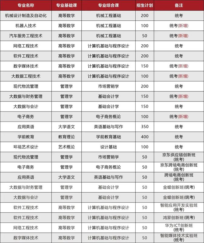 现代物流管理(京东供应链创新班)、电子商务(京东跨境电商创新班)、应用英语(跨境电商创新班)、大数据与财务管理(金蝶创新班)、大数据与会计(金蝶创新班)、软件工程技术(智能应用开发实验班)、软件工程技术(鸿蒙创新班)、网络工程技术(华为ICT创新班)、数字媒体技术(智能媒体技术实验班)。