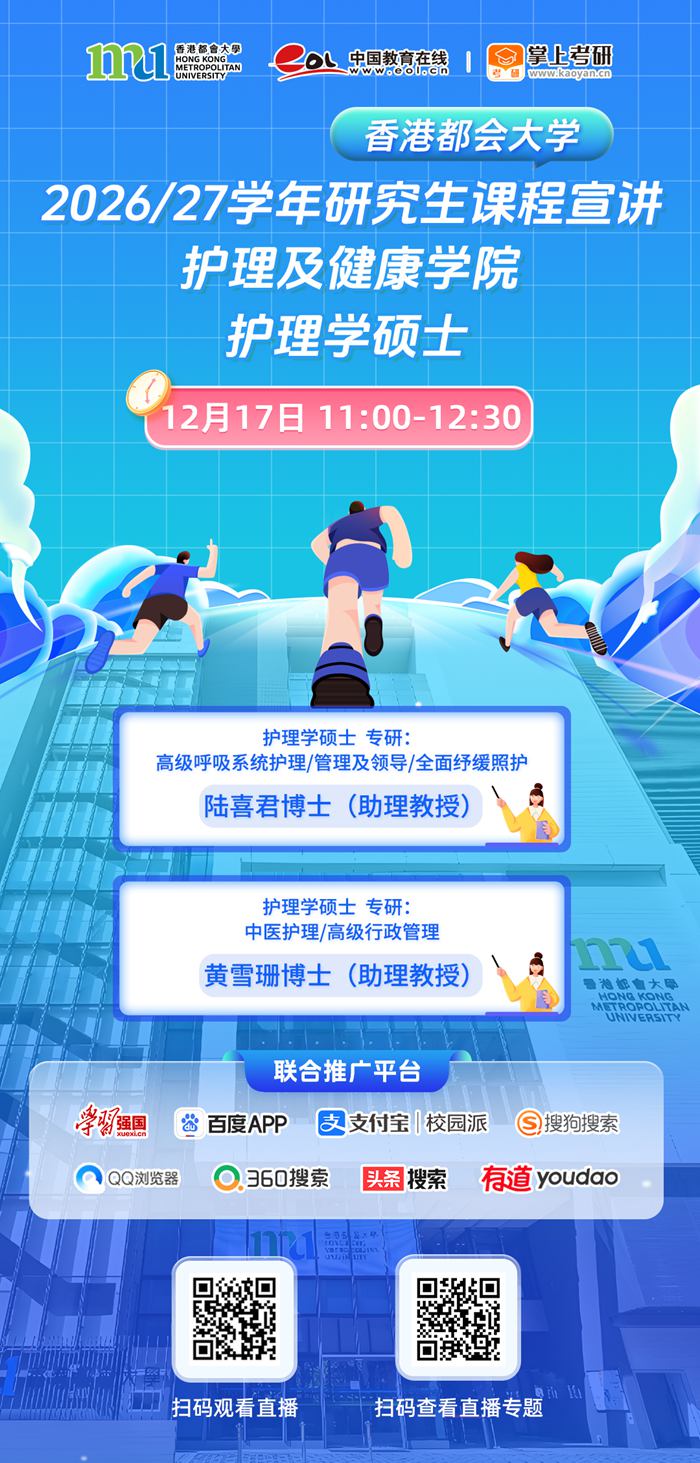 直播预告|2025年12月17日11:00,2026/27学年香港都会大学护理及健康学院研究生课程招生宣讲会精彩来袭!