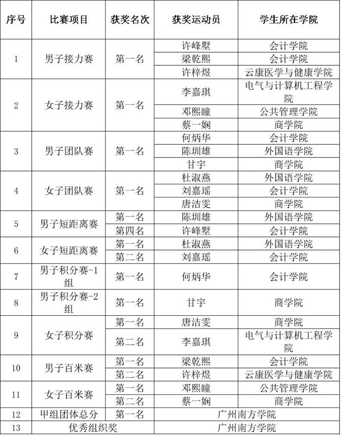 本次参赛队伍由来自广州南方学院7个学院的12名运动员组成,体育教学中心教师郑嘉怡、彭彬、梁嘉敏、朱兴涛组成教练团队。比赛中,队员们凭借扎实的训练基础、默契的团队协作与灵活的临场战术,在接力赛、百米赛、团队赛、短距离赛、积分赛五个项目中出色发挥,展现出学校学子昂扬向上的精神风貌与体育竞技水平。