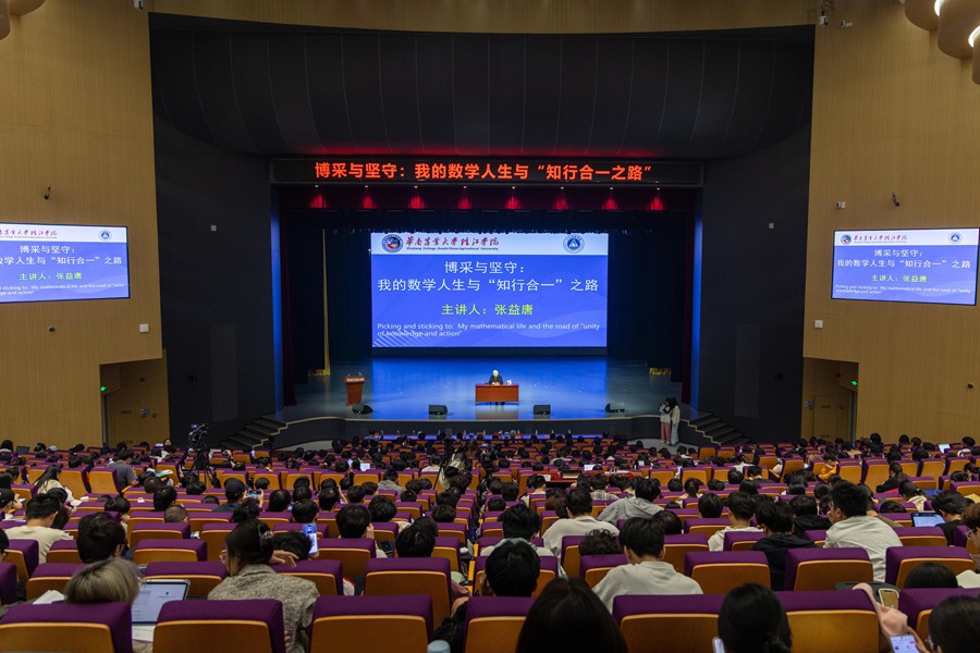 演讲中,张益唐以华珠“知行合一,笃行致远”的校训为引,从明代思想家王阳明的“知行合一”理念展开,结合自身数十年学术历程,阐释了一名数学家如何将知识积累转化为解决重大问题的能力。张益唐认为,“知行合一”对数学家而言,意味着将长期积累的数学工具与解决实际难题的行动相统一。“数学研究不是孤立的定理推导,而是运用所学工具突破瓶颈的过程。”他指出,正是在孪生素数猜想研究中,他运用早年积累的代数几何工具,才最终实现关键突破。